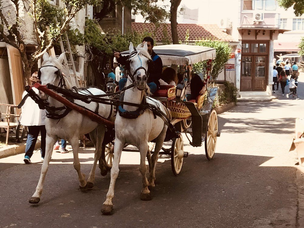 Evet başından beri yazıyoruz, bu adada motorlu taşıt yok, bisiklet var, fayton var, sessizlik var. Tabi bunlar olmayınca aman sokaklar bizim deyip sokak ortasından geniş geniş yürüyemiyorsunuz. At nalı seslerine dikkat edin adada fayton ulaşımı çok yaygın. Dolayısı ile bir fotoğraf çekeceğim diye pozisyon alırken fayton çıkabilir karşınıza.