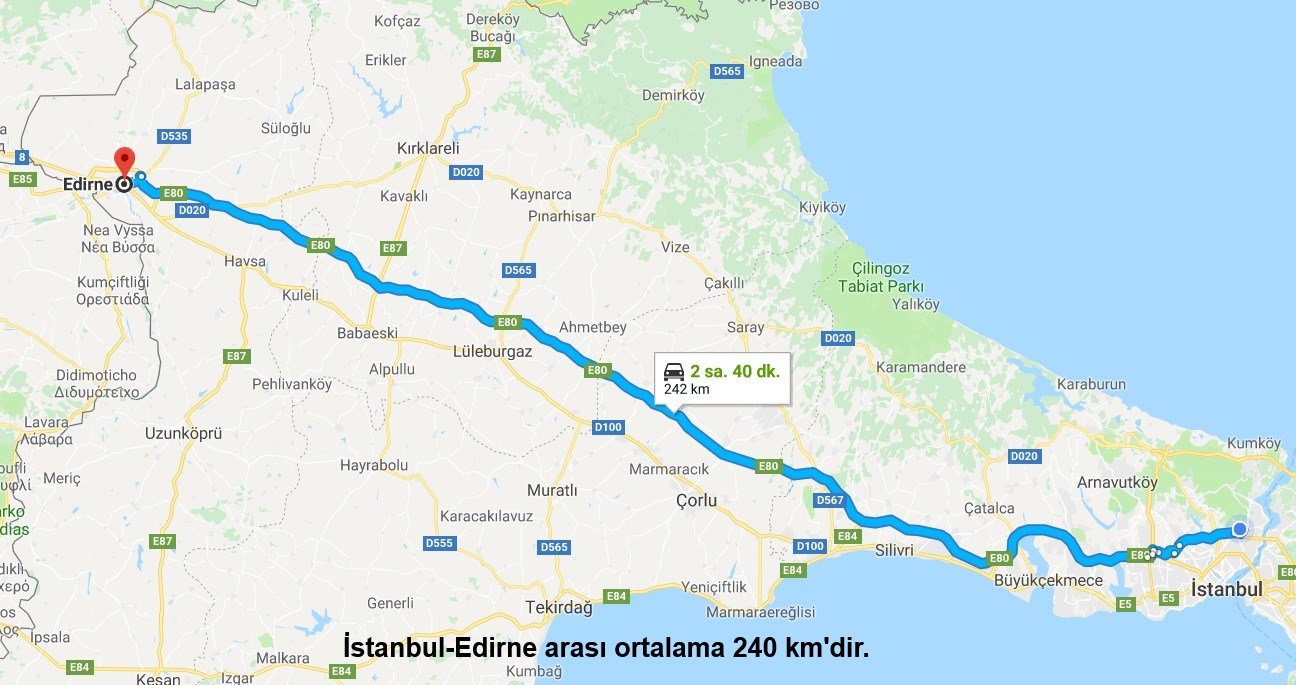 Edirne’ye yol tarifi bulunmak en kolayı olsa gerek. İstanbul’dan ulaşacaklar için her tabelada mutlaka Edirne kelimesini görürsünüz. İstanbul’a yaklaşık 240 km olan kente İstanbul’daki yoğun trafiği bertaraf ettikten sonra boş yollarda hız sabitleyiciyi kullanarak ulaşmak oldukça uygundur.