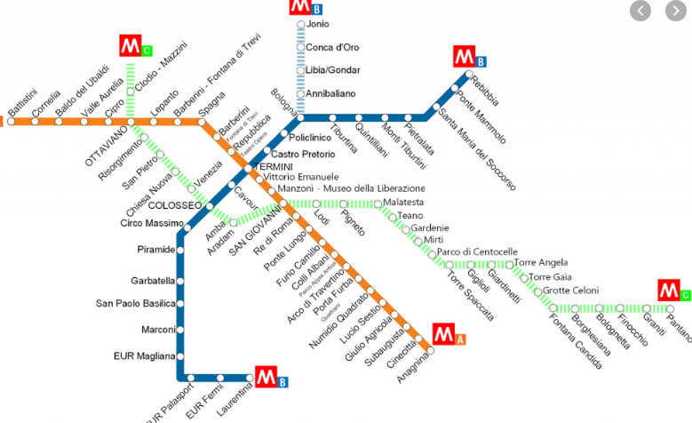 Bunun dışında birazda Roma içindeki ulaşımdan bahsedelim. Eğer hava güzel ve bahar aylarında iseniz Roma’yı sadece yürüyerek bile keşfedebilirsiniz. Çünkü Roma o kadar tarihi ve güzel bir şehir ki her köşe başında bir tarihi yapı, güzellik veya süslü bir meydan bulacaksınız. Tabi bu biraz da konaklayacağınız yere bağlı. Roma’nın metro haritası ise aşağıdaki gibi.