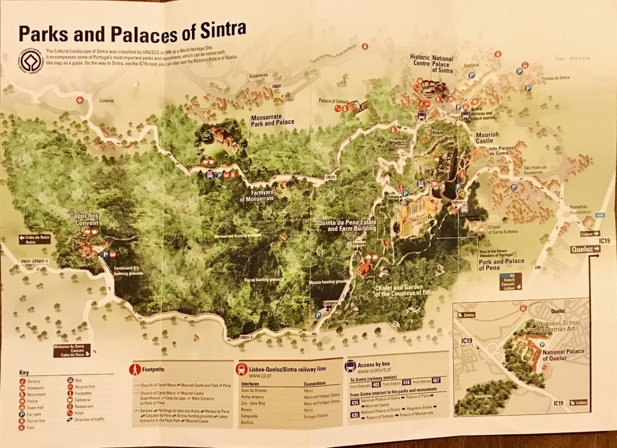 Pena’nın öyküsü 12. yüzyıla değin uzanır. Burada varlığını sürdüren bir şapel, 1838’de Portekiz Kralı bu şapelin yanına bir saray inşa etme emrini veriyor. İçerdiği bahçesileriyle övgüyü hakeden Pena sizi masalsı dünyasına davet ediyor. Aşağıda Sinra ve çevresindeki ulusal park ve sarayları gösteren bir harita var.